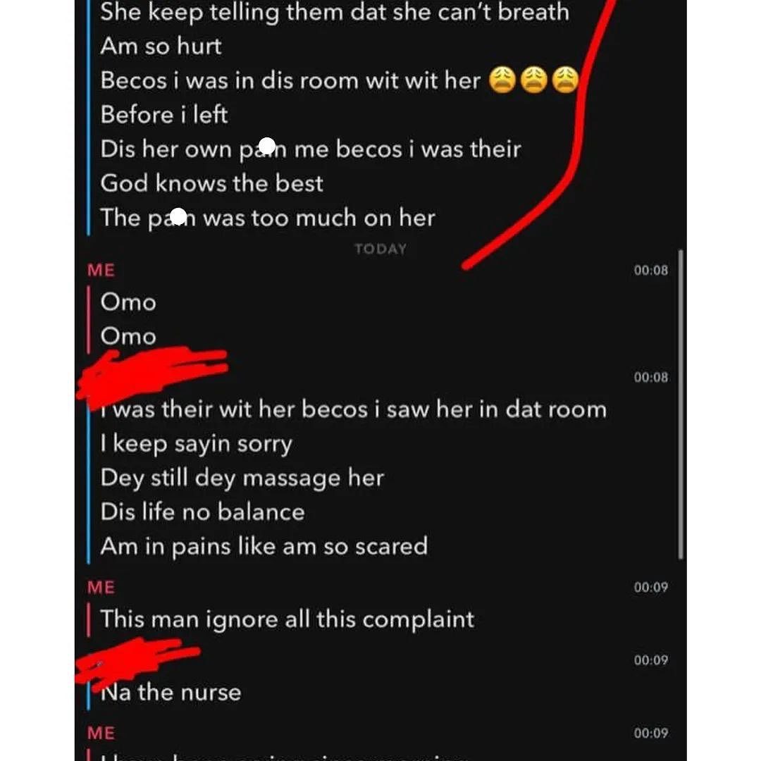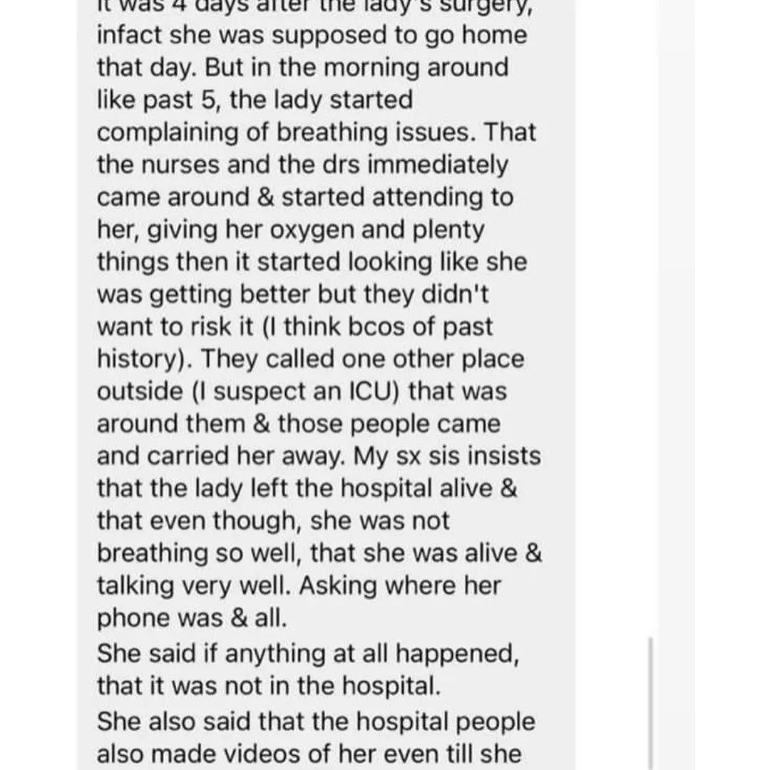 “It was four days after the lady’s surgery, in fact she was supposed to go home that day. But in the morning around like past 5, the lady started complaining of breathing issues. That the nurses and the drs immediately came around & started attending to her, giving her oxygen and plenty things then it started looking like she was getting better but they didn’t want to risk it (I think bcos of past history).