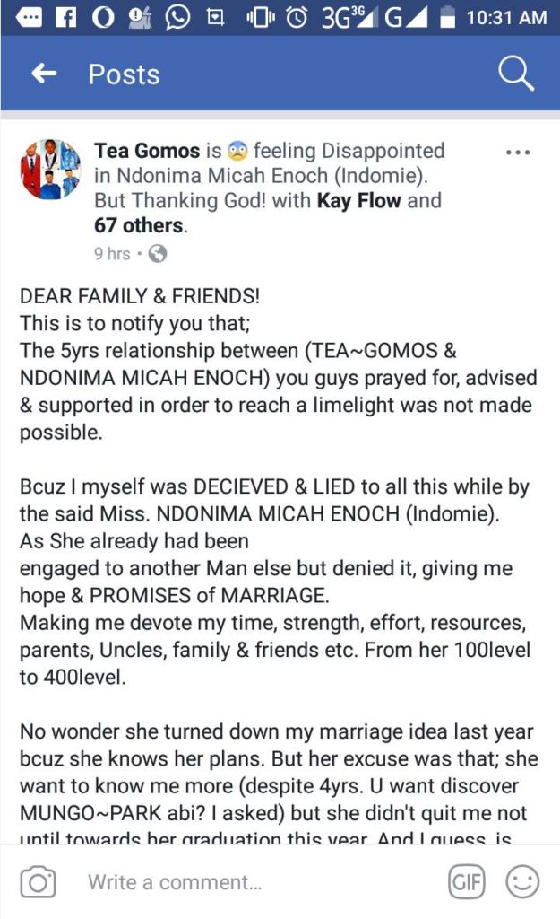 A jilted Nigerian man, Tea Gomos has taken to Facebook to call out his ex-girl friend, Ndonima Micah Enoch for allegedly deceiving him during the course of their five year relationship.