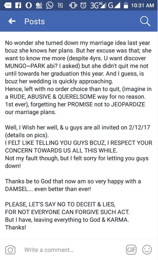 According to him, he cared and supported her all through her university days and introduced her to family and friends only to find out she was engaged to someone else, shortly before the wedding.