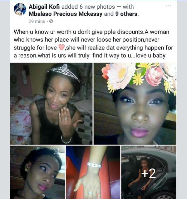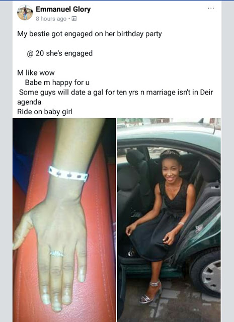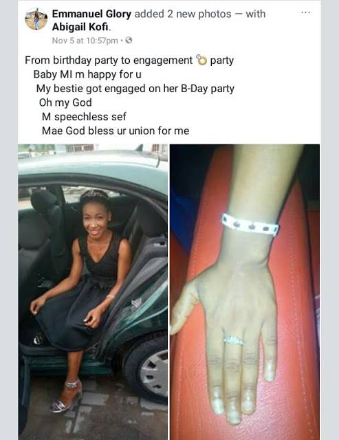 A Facebook User, Emmanuel Glory, has shared photos of her best friend, Abigail Kofi, who, yesterday on her 20th birthday got engaged to her man.