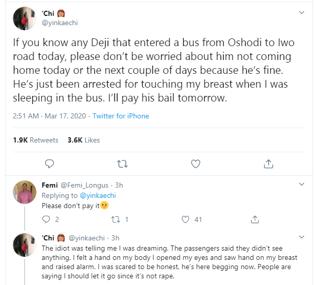 If you know any Deji that entered a bus from Oshodi to Iwo road today, please don’t be worried about him not coming home today or the next couple of days because he’s fine. He’s just been arrested for touching my breast when I was sleeping in the bus. I’ll pay his bail tomorrow.