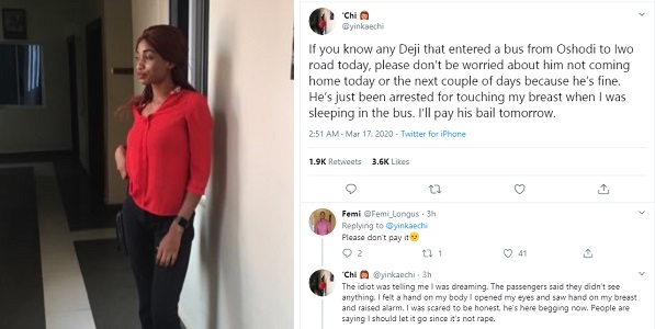 A Nigerian lady took to Twitter to disclose that she got a man arrested for touching her boobs while she was sleeping in a bus in Lagos.