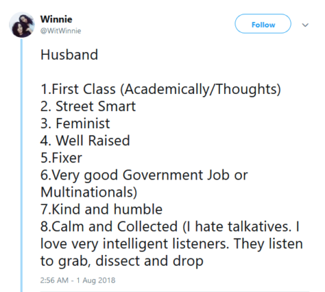 A Nigerian lady by the name Winnie has taken to Twitter to itemize the list of the qualities husband must possess.