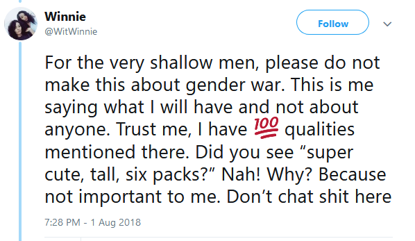 For the very shallow men, please do not make this about gender war. This is me saying what I will have and not about anyone. Trust me, I have qualities mentioned there. Did you see “super cute, tall, six packs?” Nah! Why? Because not important to me. Don’t chat shit here