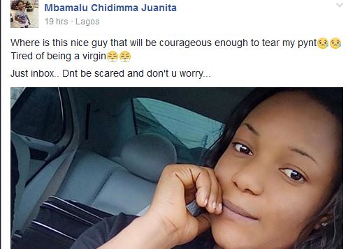 The things we see on Social media y’all… This Nigerian lady, Chidinma, by name, literally took to her Facebook page to ask any guy to disvirgin her.