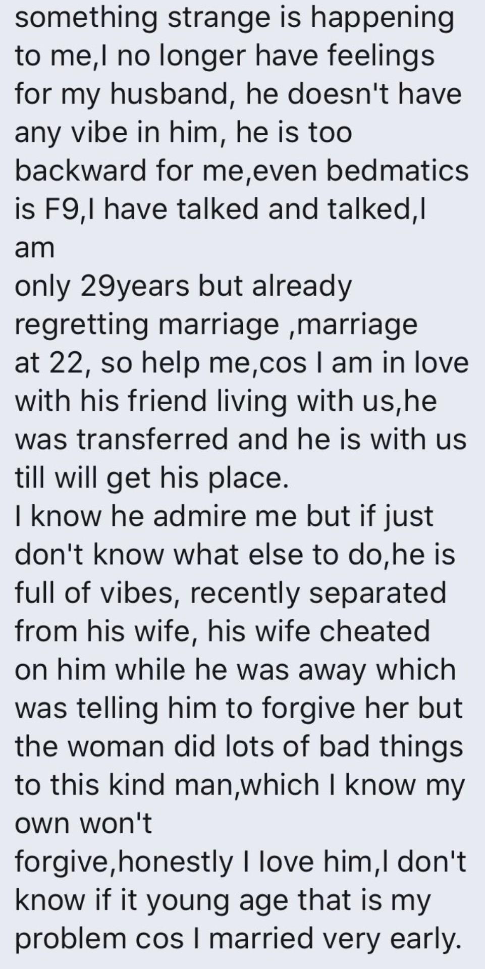 According to the lady, her husband has no vibes and she regrets getting married to him. The married lady then revealed that she’s fallen deeply in love with his friend who visited them and stayed in their house.