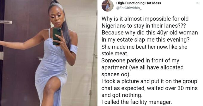 The Twitter user with handle @FatGirlwithin_ explained that the elderly woman, who lives in her estate, gave her a resounding slap after she expressed her displeasure with her over a misunderstanding they had about parking lot space in the estate.