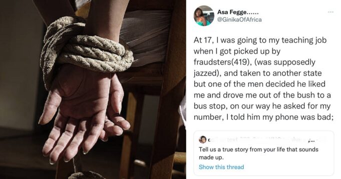 The lady identified as @GinikaofAfrica on Twitter, who made this revelation while reacting to a tweet asking Twitter users to share a true-life story that sounds made up, also said that he provided her with the names and hideouts of her kidnappers.
