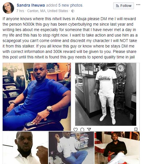 According to Sandra Iheuwa on Facebook, the guy in the photos, presumably living in Abuja has been stalking her and “telling lies” about her since last year and she plans to put him in jail over this… all she needs is his location.