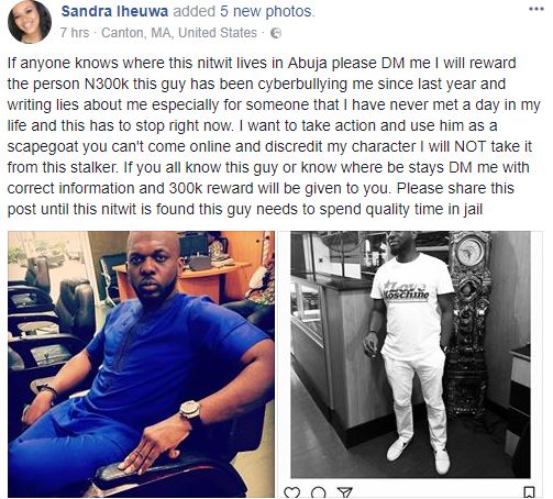 A Nigerian lady has shared how a guy has allegedly been bullying her on social media and to curb his mischievous acts, she’s taken to Facebook to ask for his location and she promises to gift anyone with N300k if they can provide his whereabouts.