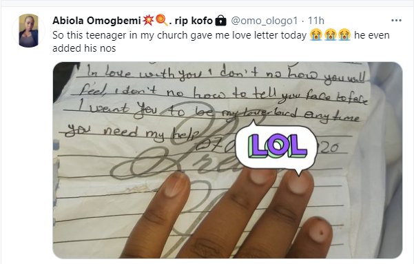 A young Nigerian lady has taken to her Twitter page to share the love letter a teenager in her church wrote to her.