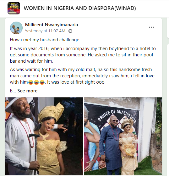 The woman identified as Millicent Nwanyimarania, who joined the ‘How I met my husband challenge’ on a Facebook page, disclosed that she had gone to a hotel in 2016 with her then lover when she met the man she eventually married.