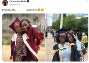 Sharing on Twitter (X), the lady @i_amlola recreated the picture pose of herself and her mum in her primary school photos when she got her Master’s degree.