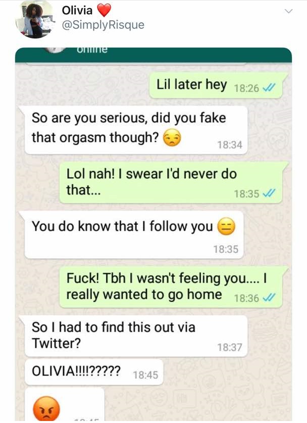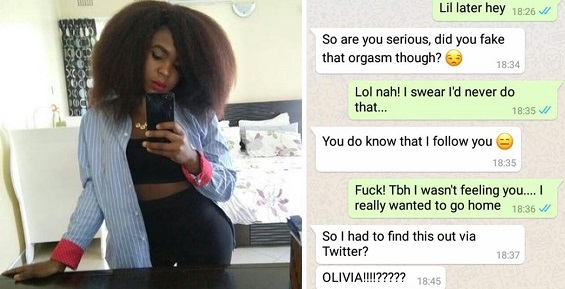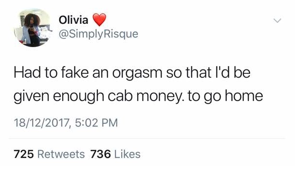 A Nigerian Lady on twitter by the name Olivia, has revealed how she had to fake an orgasm to probably leave her man satisfied so he could give her enough cab money to go home.