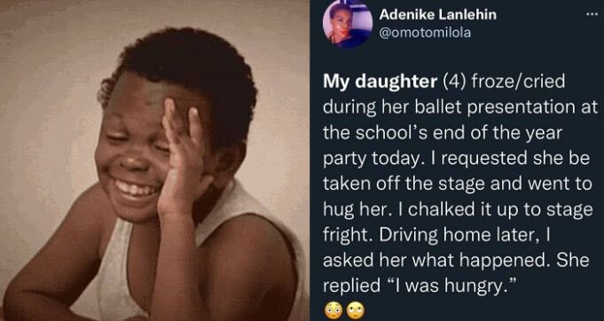 According to the lady, with handle, @omotomilola, during her daughter’s ballet presentation, the little girl burst into tears all of a sudden.