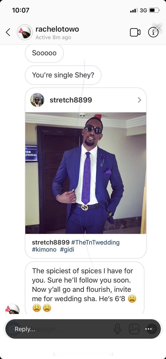 According to the Twitter user, @rachelotowo and screenshots of the DM she shared with her friend, she’d set up her friend with the man and jokingly asked that they invite her to their wedding.