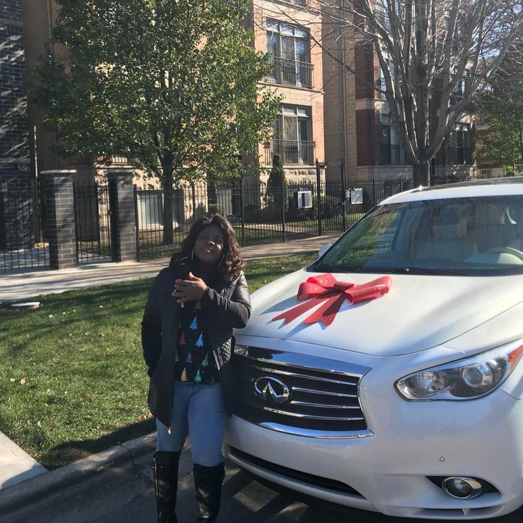 The lovely lady who couldn’t believe the new whip was hers, screamed and jumped for joy after seeing her new white midsize-SUV.