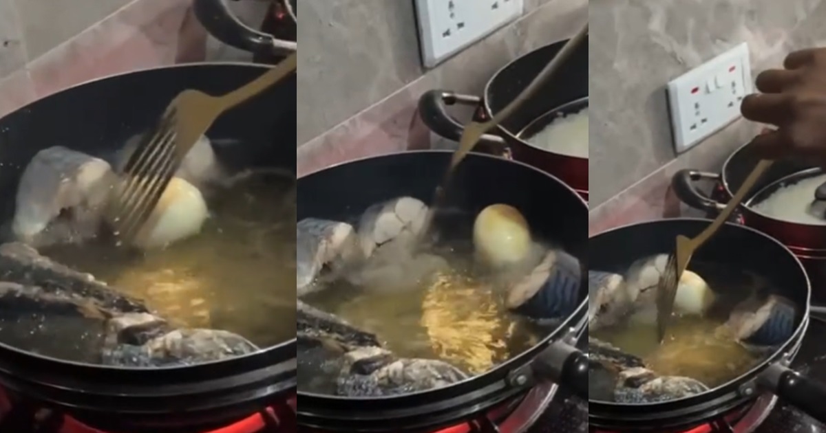 In the video, the lady is seen in the kitchen frying fish, while also placing boiled eggs in the same pan.