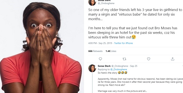 A Nigerian lady on Twitter has narrated the aftermath of her older male friend’s decision to dump his girlfriend of 3 years to marry a virgin and ‘virtuous woman’ he dated for only 6 months.