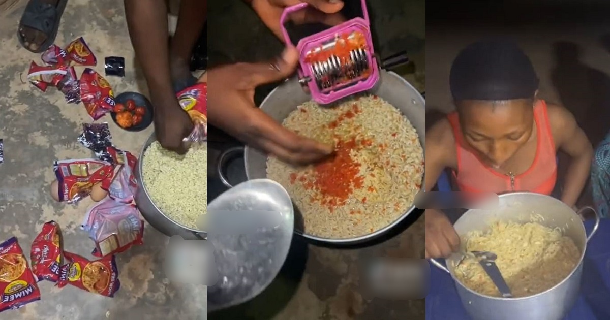 Nigerian Lady Shocks Viewers Online With Her Superhuman Eating Skills, As She Devours 10 Packs Of Noodles In One Sitting (WATCH)