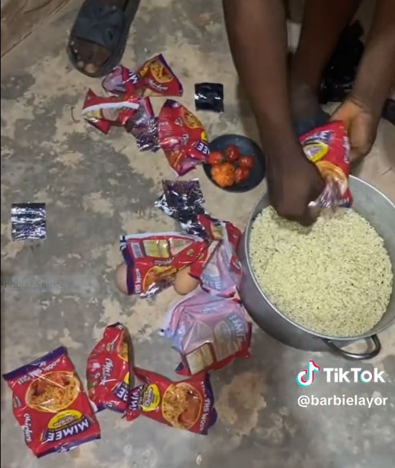 The video, which has been shared across various platforms, shows the young woman surrounded by her impressive culinary feat, with 10 packs of noodles, 2 eggs, and an empty bottle of soda.