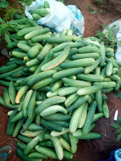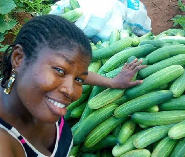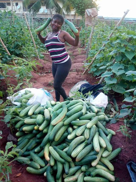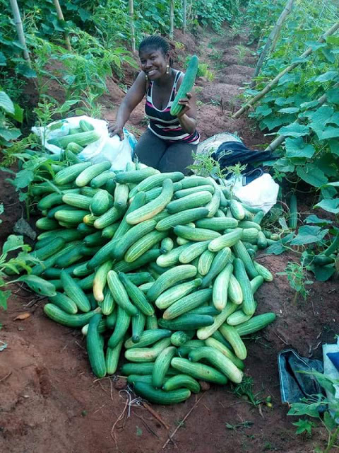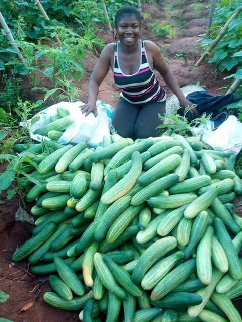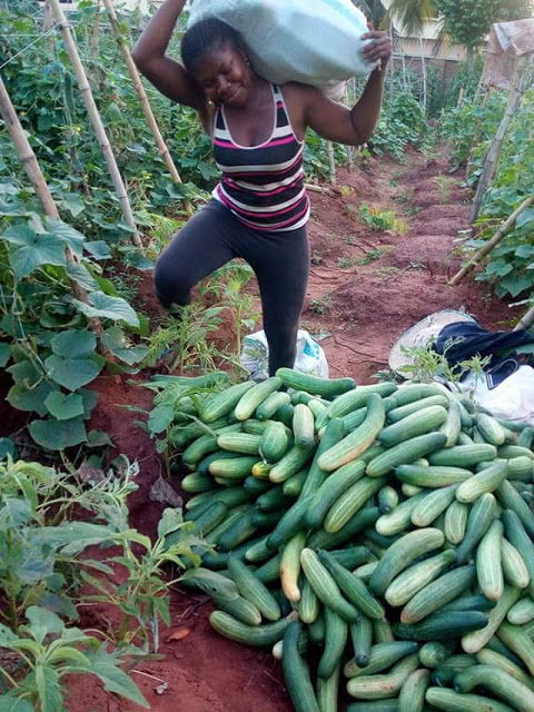 A Pretty Nigerian Lady, identified as Mgbeke who is a proud Cucumber farmer, is over the moon after a bountiful harvest.