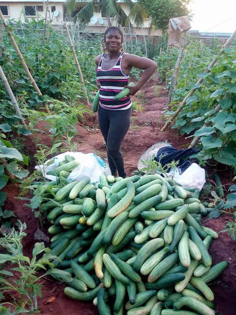 Taking to Facebook, she posted photos of the Cucumbers she harvested from her farm in Anambra State.