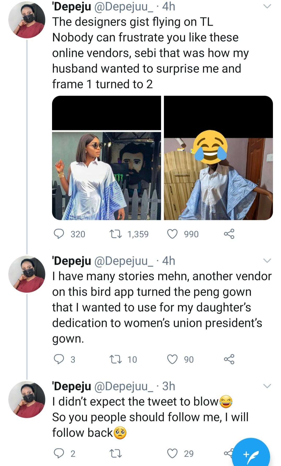 “I have many stories mehn, another vendor on this bird app turned the peng gown that I wanted to use for my daughter’s dedication to women’s union president’s gown.”