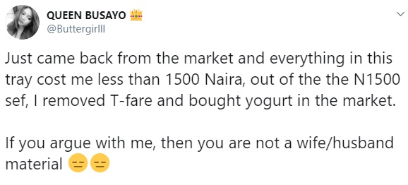 A Nigerian Lady has taken to micro-blogging platform, twitter to show off the things she bought from the market with just One Thousand Five Hundred Naira only.