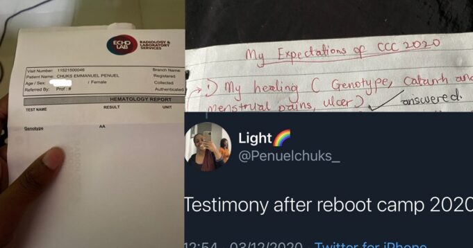 According to @PenuelChuks_ who testified about the miracle on the micro-blogging platform, it was part of her “2020 expectations” to see her genotype change, receive total healing from catarrh and ulcer.