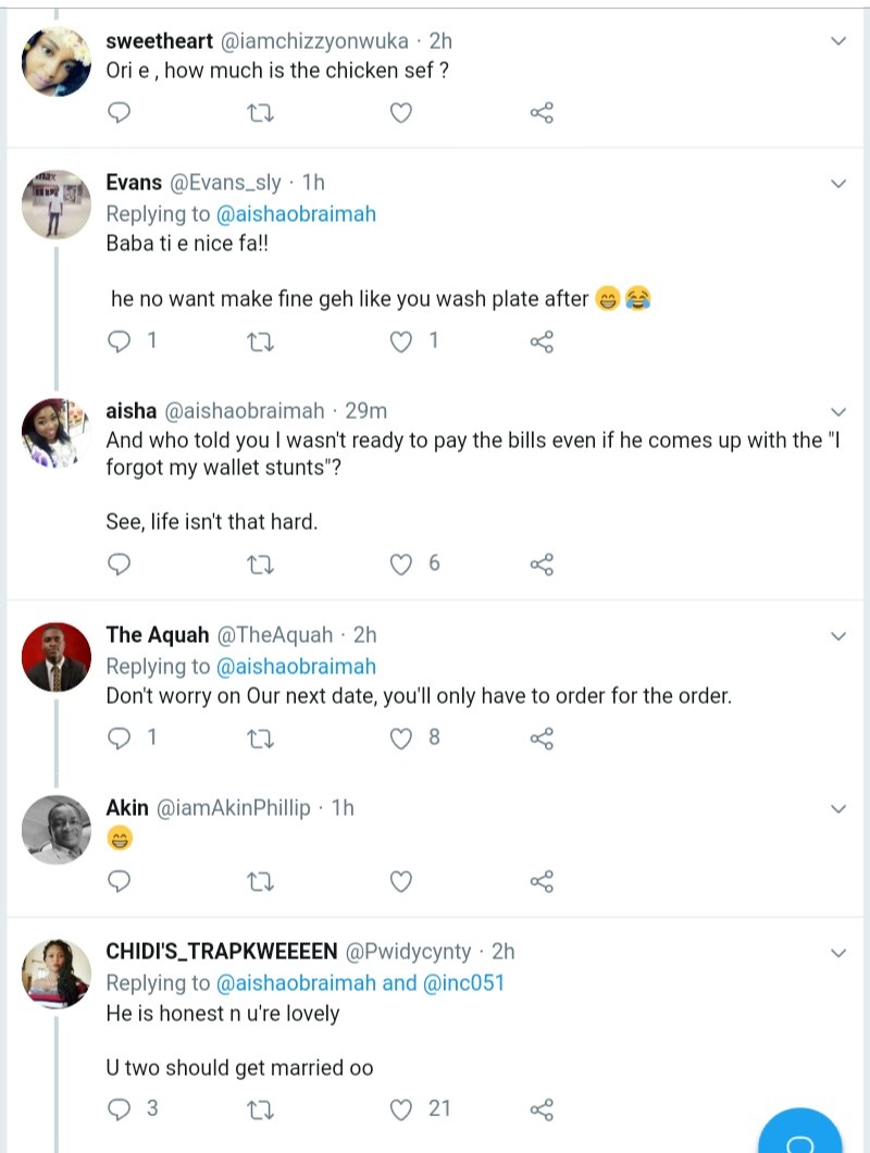 When they got to the location for them to have a nice time, he was begging the lady not to order for chicken instead she should order for beef because he doesn’t have much money on him.