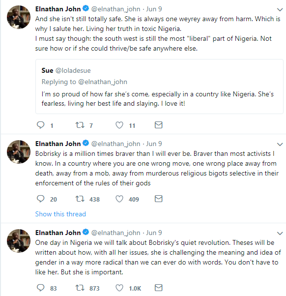 Bobrisky is a million times braver than I will ever be. Braver than most activists I know. In a country where you are one wrong move, one wrong place away from death, away from a mob, away from murderous religious bigots selective in their enforcement of the rules of their gods.