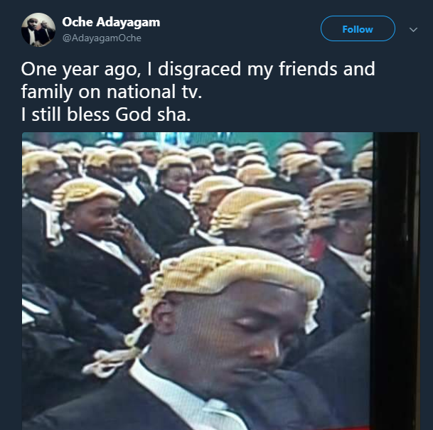 The young Lawyer, Oche Adayagam who was caught on national TV dozing off during his Call to Bar ceremony last year, has now taken to micro-blogging website, Twitter to recall the memorable event by sharing the photo to mock himself.