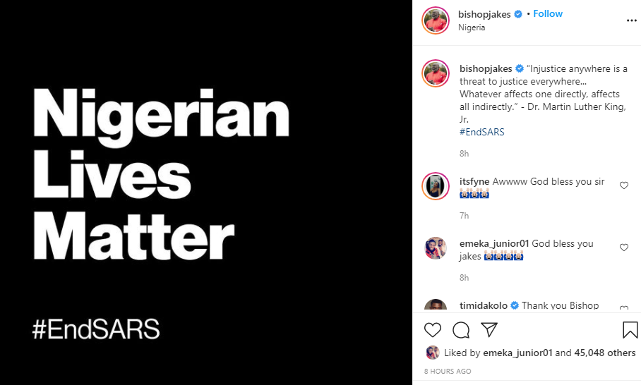 “Injustice anywhere is a threat to justice everywhere… Whatever affects one directly, affects all indirectly.” – Dr. Martin Luther King, Jr. #EndSARS”.