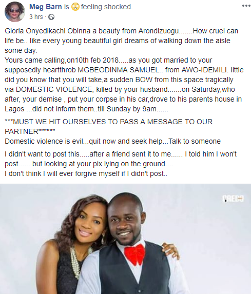 “via DOMESTIC VIOLENCE, killed by your husband…….on Saturday,who after, your demise , put your corpse in his car,drove to his parents house in Lagos …did not inform them..till Sunday by 9am……***MUST WE HIT OURSELVES TO PASS A MESSAGE TO OUR PARTNER******”