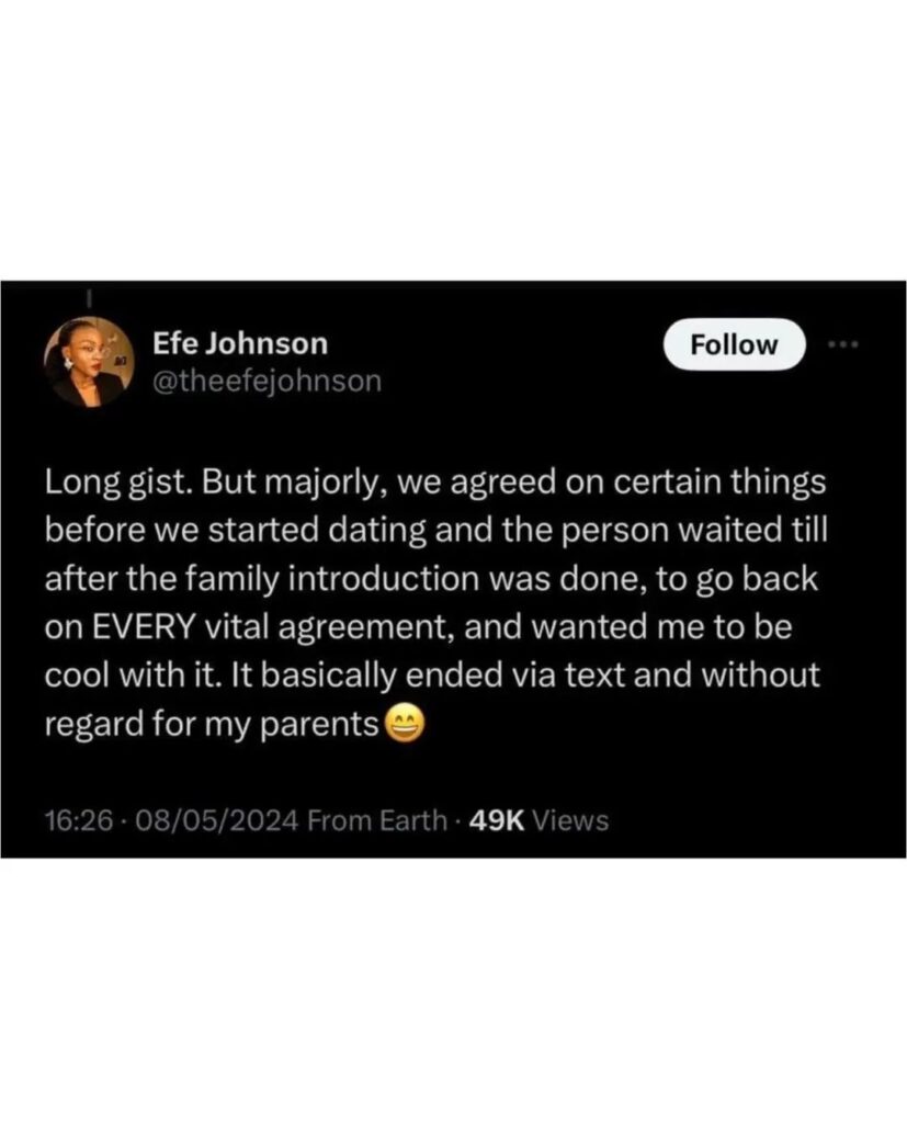 It all started when a woman named Efe Johnson shared her experience on the microblogging platform X, revealing that her fiancé called off their engagement after they had completed a formal introduction and were preparing for marriage.