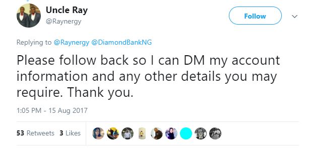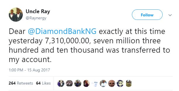 A Nigerian Man has taken to Micro-blogging site, Twitter to cry out after he received a credit alert of over 7 million naira in his Diamond Bank Account.
