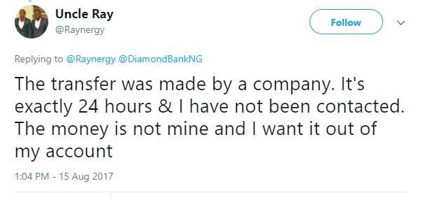 The user, @raynergy, said the transfer was made by a company, though he didn’t disclose what company, but it’s been 24 hours, and he hasn’t been contacted by the bank or the company. He wrote;