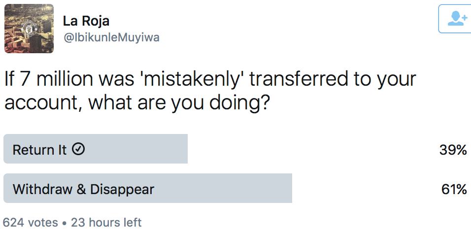 This immediately prompted a Twitter poll by a Nigerian, who asked other Nigerians what they’d have done if they got a credit alert from an unknown source.