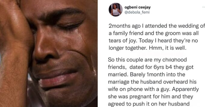 A Nigerian Twitter user with the name, Ogbeni Ceejay has taken to his page to narrate how the couple dated for 6 years and officially tied the knot 2 months ago. Unfortunately 1 month after the wedding their marriage crumbled.