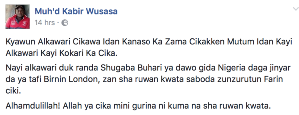 Nayi alkawari duk randa Shugaba Buhari ya dawo gida Nigeria daga jinyar da ya tafi Birnin London, zan sha ruwan kwata saboda zunzurutun Farin ciki.