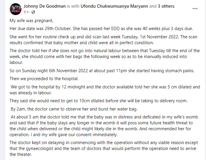 A Nigerian man identified as Johnny has called out a hospital in Portharcourt for negligence resulting in the death of his pregnant wife.
