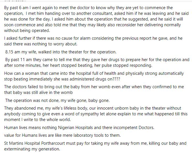 St Martins Hospital Portharcourt must pay for taking my wife away from me, killing our baby and exterminating my generation.”