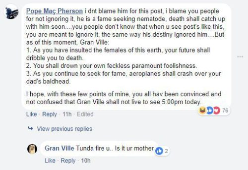 “i dnt blame him for this post, i blame you people for not ignoring it, he is a fame seeking nematode, death shall catch up with him soon….you people don’t know that when u see post’s like this, you are meant to ignore it, the same way his destiny ignored him….But as of this moment, Gran Ville: