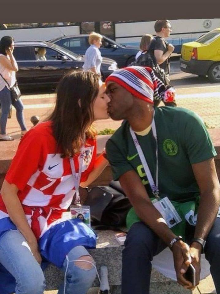 A Nigerian man who was spotted donning the Super Eagles jersey kissed his Croatian partner publicly near the Kaliningrad Stadium in Russia at the ongoing world cup tournament.