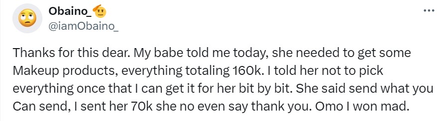 “My babe told me today, she needed to get some Makeup products, everything totaling 160k. I told her not to pick everything once that I can get it for her bit by bit. She said send what you Can send, I sent her 70k she no even say thank you. Omo I won mad.”
