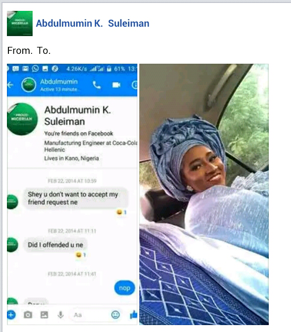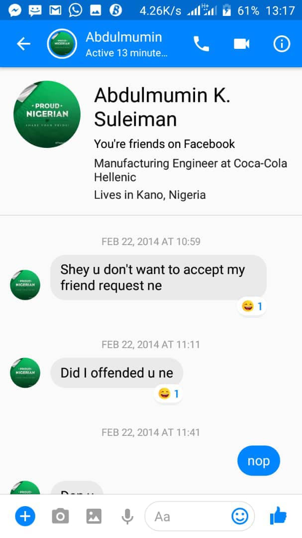 “Shey you don’t want to accept my friend request ne. Did I offend u ne?” he wrote.