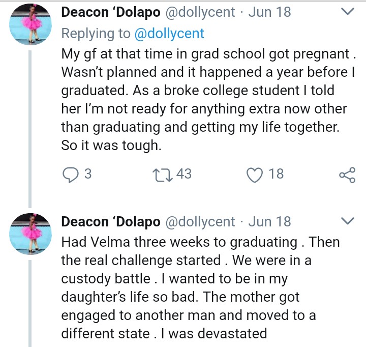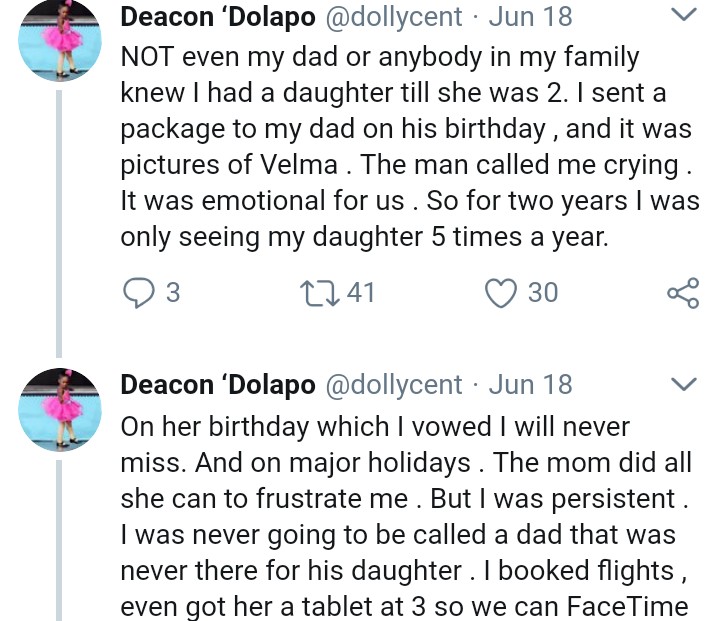 A Nigerian Twitter user with the handle, @dollycent has narrated how he got to win custody of his daughter, Velma after a bitter fight with his baby mama.