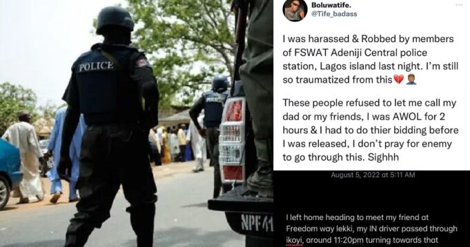 “I was harassed & Robbed by members of FSWAT Adeniji Central police station, Lagos island last night. I’m still so traumatized from this💔🤦🏽♂️. These people refused to let me call my dad or my friends, I was AWOL for 2 hours & I had to do thier bidding before I was released, I don’t pray for enemy to go through this. Sighhh”.