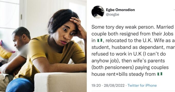 “Some tory dey weak person. Married couple both resigned from their Jobs in , relocated to the U.K. Wife as a student, husband as dependant, man refused to work in U.K (I can’t do anyhow job), then wife’s parents (both pensioneers) paying couples house rent+bills steady from Nigeria”.